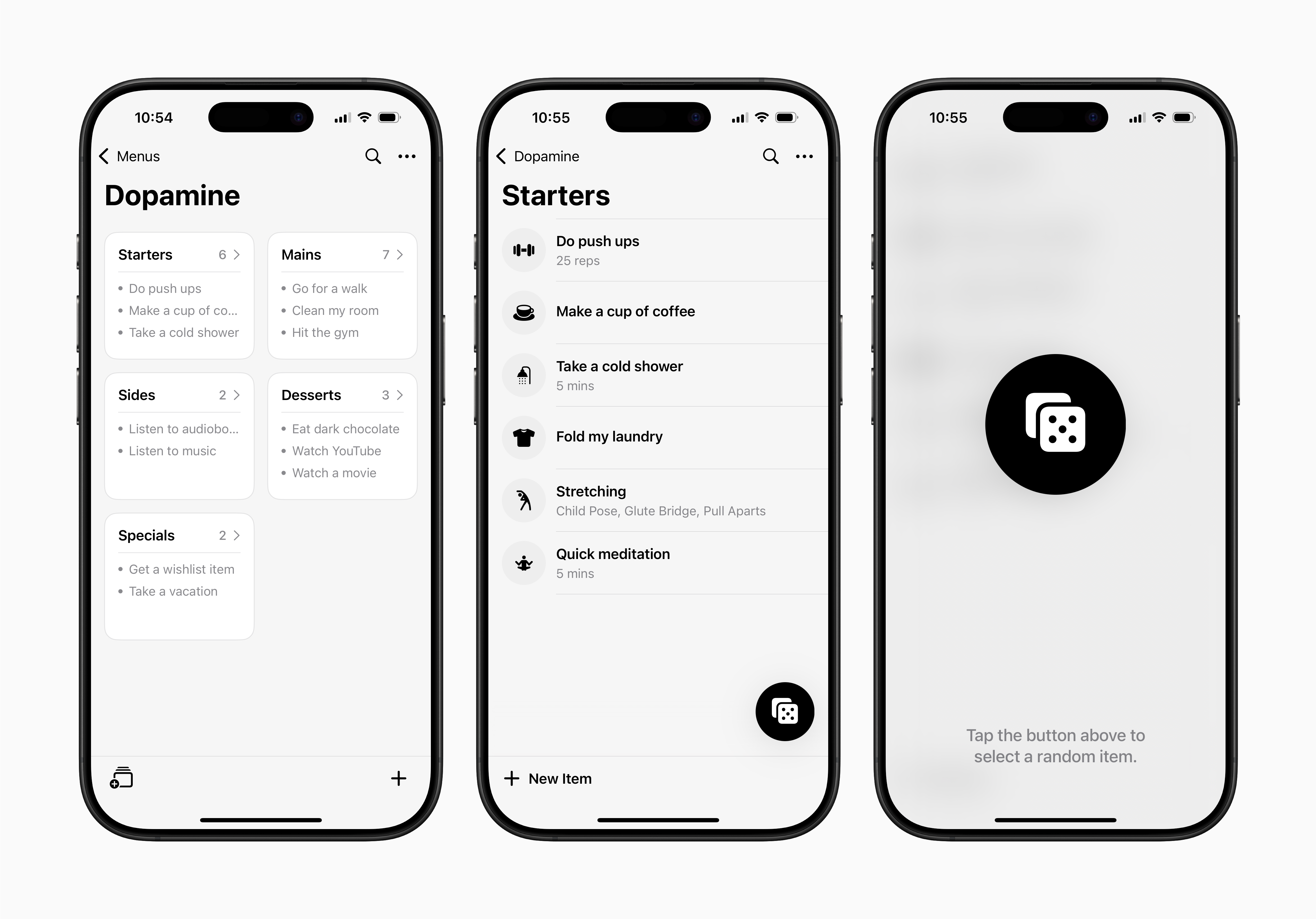 The idea for the app originated from the desire to create a Dopamine Menu, which is a list of activities to substitute for phone use.